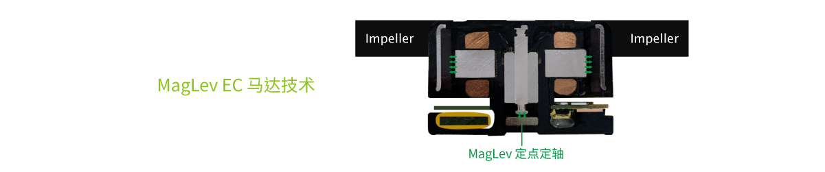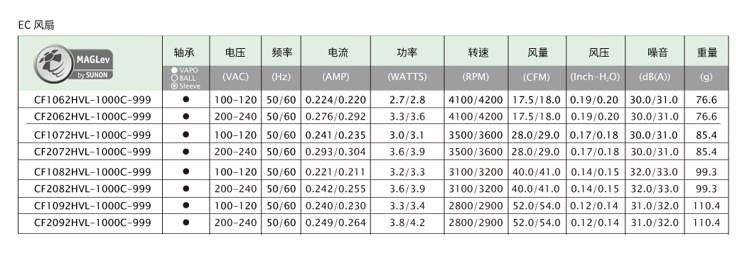 SUNON MagLev EC風扇透過卓越磁浮馬達的垂直磁浮引力系統,馬達運轉達到定點定軌的穩定運轉軌道,重心穩定較不易搖晃震動,減少軸心與軸承接觸摩擦,再配合VAPO軸承技術,材料和結構皆經強化處理,改善普遍SLEEVE軸承不耐高溫的缺點,讓風扇達到低振動、低噪音、長壽命的多項優點。