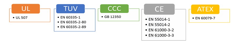 SUNON EC產品銷售各大洲,深知散熱方案使用安全的重要性,為提供海外客戶具高質量防護且無危害性的散熱方案,SUNON EC風扇取得多項國際安規認證項目以符合各海外市場對于輸入產品安全的規范。
